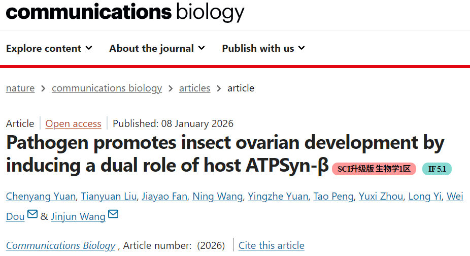 近日,学院王进军教授/豆威教授课题组在Nature旗下期刊Communications Biology上发表了题为“Pathogen promotes insect ovarian development by inducing a dual role of host ATPSyn-β”的研究论文。该研究首次在柑橘黄龙病主要传播媒介亚洲柑橘木虱(Diaphorina citri Kuwayama)中,揭示了柑橘黄龙病菌亚洲韧皮部杆菌(Candidatus Liberibacter asiaticus,CLas)通过上调柑橘木虱ATP合成酶β亚基(ATPSyn-β)基因表达,从能量与营养供应两方面促进媒介昆虫卵巢发育与交配行为的分子机制。研究深化了对植物病原微生物促进媒介昆虫生殖系统发育分子调控机制的理解。