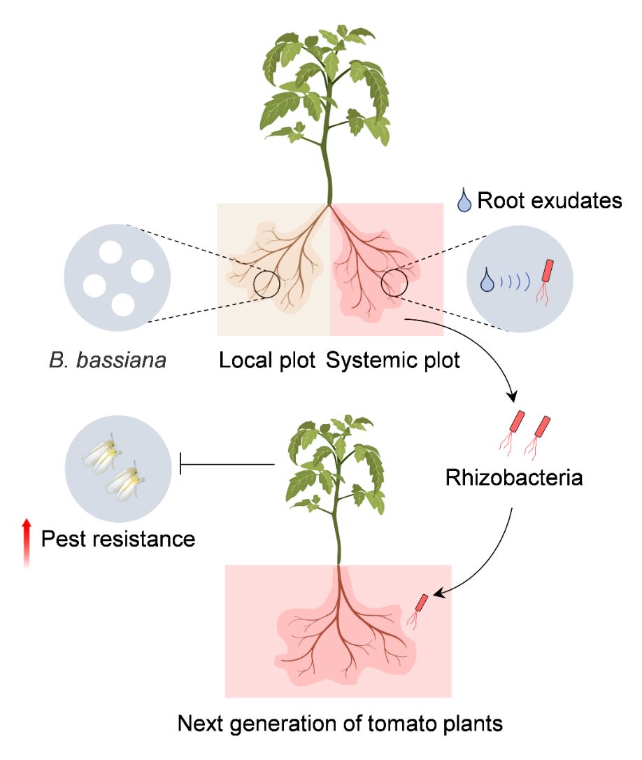 植物在遭受病虫害胁迫时会触发“呼救”响应,通过招募并富集根际有益微生物群落来增强自身对胁迫的适应性。然而,这类生物激发子往往对植物产生不利影响,从而限制了其在农业生产中的实际应用。因此,探索利用对植物无害的激发子,精准塑造具有抗虫功能的土壤微生物群落,是当前植物微生物组介导的生物防治领域亟待解决的关键问题。本研究聚焦可内生定植于植物且无致病性的虫生真菌球孢白僵菌,探究其作为非致病性激发子在番茄“求救”响应中的作用机制,为利用微生物组介导的植物防御提供新途径。