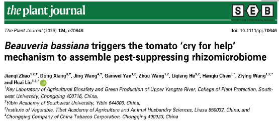 近日,学院刘怀教授团队在TOP期刊《the plant journal》发表研究论文“Beauveria bassiana triggers the tomato ‘cry for help’ mechanism to assemble pest-suppressing rhizomicrobiome”。该研究聚焦球孢白僵菌(Beauveria bassiana),为农业害虫绿色防控提供了新策略。
