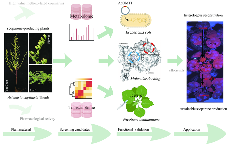 香豆素类化合物作为一类重要的植物次生代谢产物,因其显著的生物活性而被广泛应用于农业病虫害的绿色管理。滨蒿内酯作为一种典型的香豆素类化合物,具有抗哮喘、降血脂和抗肿瘤等多种药理活性,同时兼具多种农业活性,尤其在农业害螨的防控上效果较好。然而,天然的滨蒿内酯主要依赖于从茵陈蒿中提取,但是,茵陈蒿生长周期长和自然产量低。因此,开发一种可持续的滨蒿内酯生物合成方法成为当务之急。针对滨蒿内酯完整生物合成途径不清晰的难题,特别是其甲基化形成过程,首先,研究团队通过代谢组学,揭示了滨蒿内酯在茵陈蒿不同组织部位的积累规律;随后,借助转录组学分析,利用加权基因共表达网络(WGCNA)和基因共表达以及差异基因分析,从茵陈蒿的转录组数据中筛选出与滨蒿内酯合成相关的关键基因;进一步,利用体外酶活测定等手段最终鉴定到了一个限速酶AcOMT1,其能够特异性催化东莨菪内酯甲基化合成滨蒿内酯;此外,通过AlphaFold2和分子对接及动力学模拟技术,研究了酶与底物的相互作用,为理解其催化机制和合理设计奠定了基础;最后,以本氏烟作为生物反应器,异源重构了滨蒿内酯的合成路径,成功实现了植物源香豆素类杀螨剂-滨蒿内酯的异源从头高效生产,标志着团队借助合成生物学技术推动了植物源杀螨剂产业发展。该研究成果不仅完整揭示了滨蒿内酯的生物合成途径,更为植物源香豆素类杀螨剂产业化提供了重要的技术支撑;未来还可通过微生物底盘合成生物学策略,绿色高效生产植物源香豆素类杀螨剂。