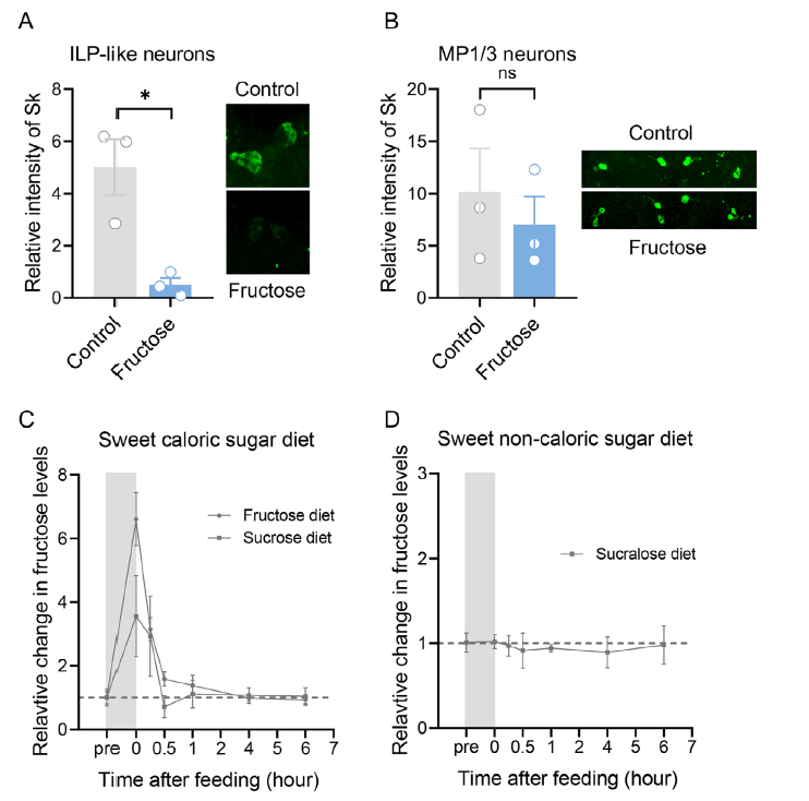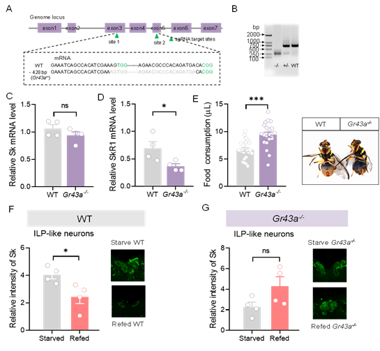 进一步研究表明,果糖受体Gr43a是感知血淋巴果糖水平的核心传感器,其通过激活大脑间脑区的Sk-ILP神经元释放Sk成熟肽,启动下游信号通路。团队通过敲除Gr43a基因发现,突变体橘小实蝇丧失了对果糖的感知能力,无法正常诱导Sk释放,摄食行为显著增加。