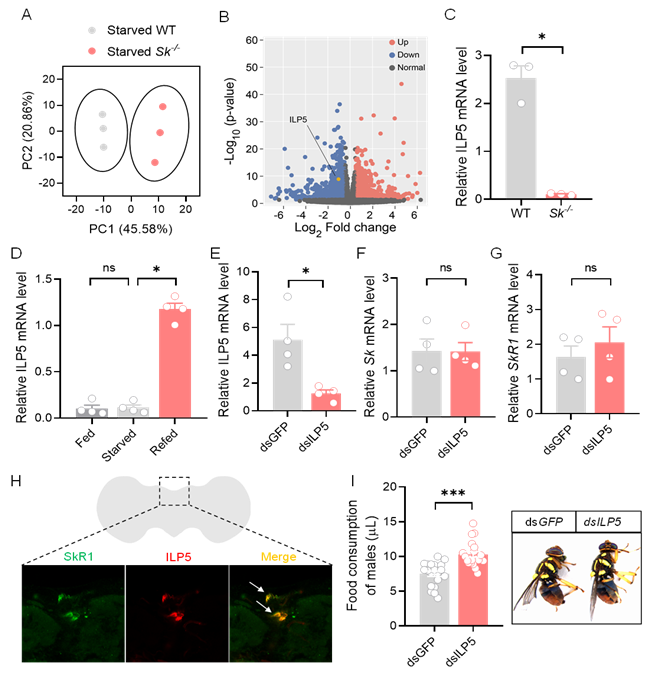 图4 敲除Sk减低ILP5表达以促进橘小实蝇进食