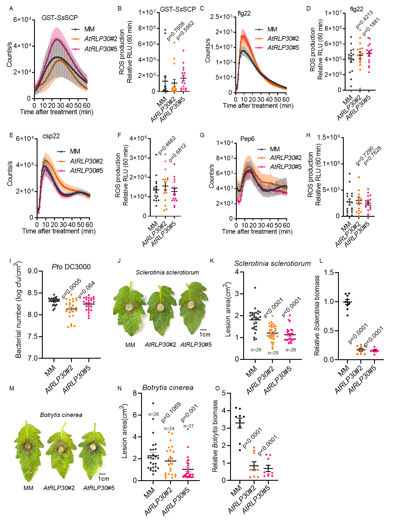 此外,本研究证实:在番茄中表达抗病受体基因 AtRLP30(图1)以及外源施用 SsSCP(图2),均可显著增强番茄对核盘菌、灰霉菌及病原细菌的抗性。表型数据显示,AtRLP30 转基因番茄的病斑面积与病原菌生物量均显著低于对照植株,抗病效果明确。这表明 AtRLP30 作为关键抗病受体,可通过分子改良手段提升作物抗病能力。后续可深入解析该受体的病原菌识别特征与作用机制,并将其应用拓展至大豆等其他作物,为作物抗病育种提供新策略与基因资源。