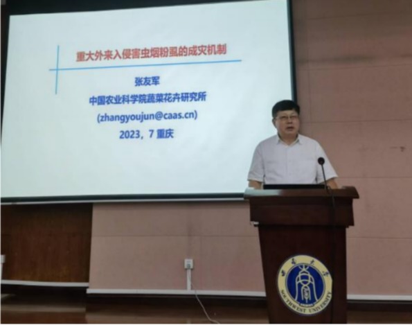 7月2日上午,植物保护学院特邀中国农业科学院蔬菜花卉研究所所长、国家级人才、国家大宗蔬菜产业技术体系首席科学家张友军研究员在隆平楼204报告厅做题为“重大农业害虫烟粉虱的成灾机制研究”的学术报告会。西南大学党委常委、副校长王进军出席并主持报告会,植物保护学院院长刘怀、副院长蒋红波、学院部分教师和全体研究生参加了此次报告会。